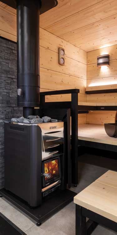 Ce principe a été reproduit dans les poêles modernes pour saunas. Qu’ils soient électriques ou à bois, ils disposent tous d’une réserve de pierres d’au moins 20 kg. Leur rôle de régulation de la température est plus important dans le cas d’un poêle à bois. En effet, sur ce type de poêle il n’y a pas de dispositif de thermostat permettant de réguler précisément la température. Les pierres permettent en partie de imiter les trop fortes variations.